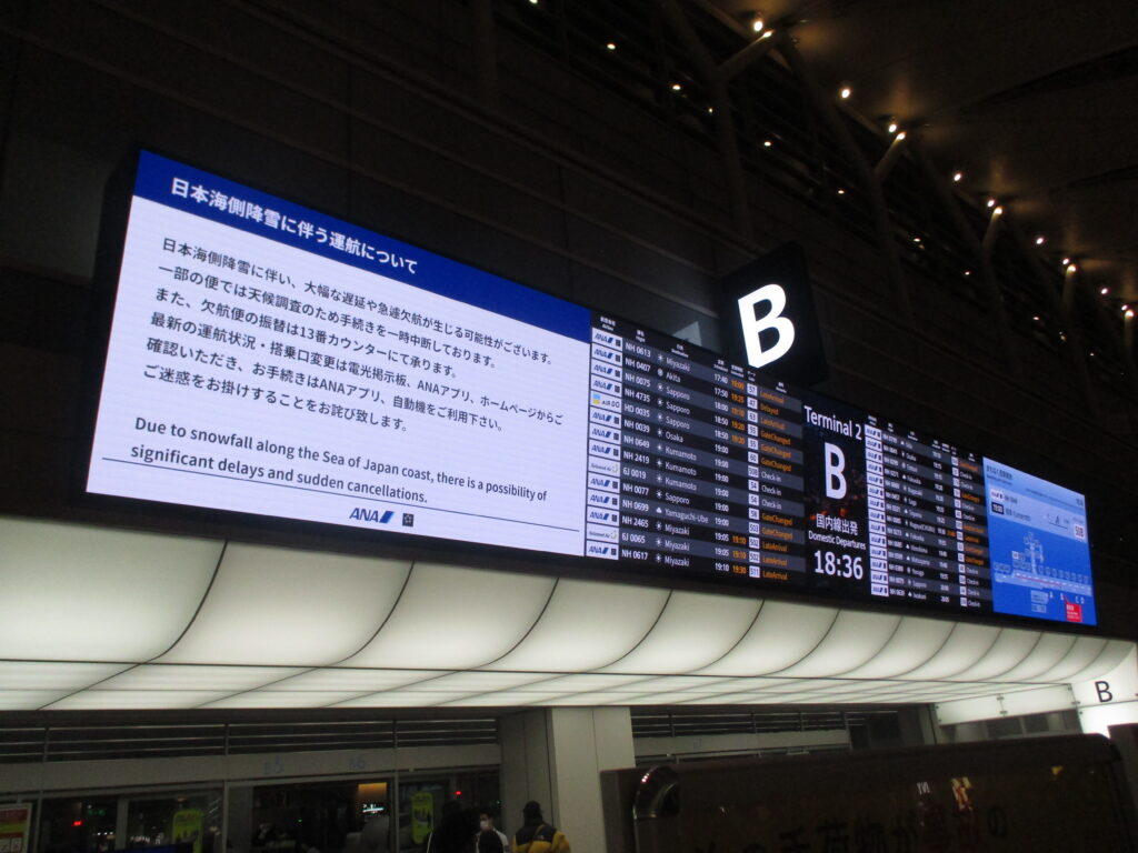 その理由は「日本海側の降雪」。私が利用する沖縄行きの便も、機材繰りや羽田空港の混雑の煽りを受けて遅れるのでは…と思い、この写真を撮っていました。