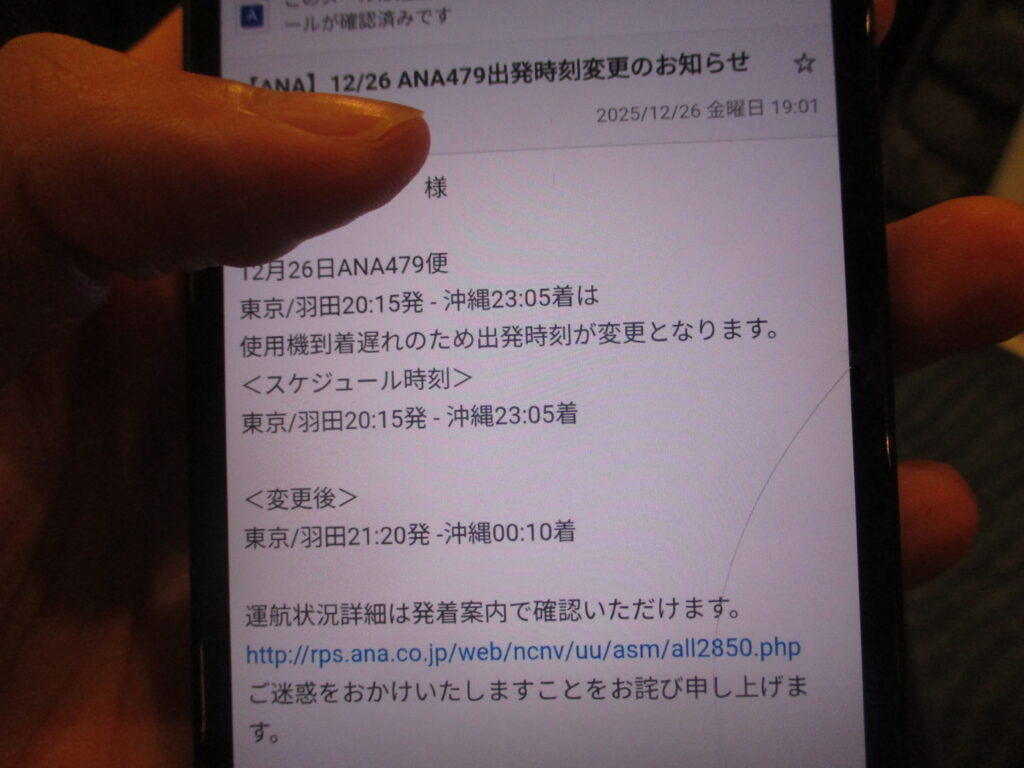 もう1通のメールが届きました。出発は1時間35分遅れの21時50分、沖縄・那覇空港に到着するのは0時40分になるとのこと。これは面白いことになってきました。