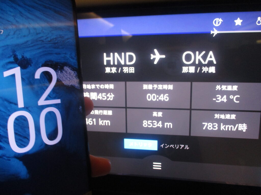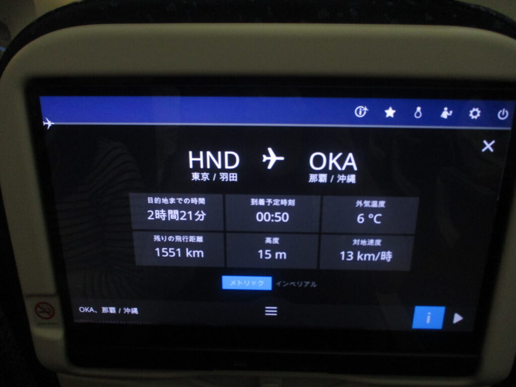 0時29分、機内のモニターに沖縄本島の明かりが見えてきました。