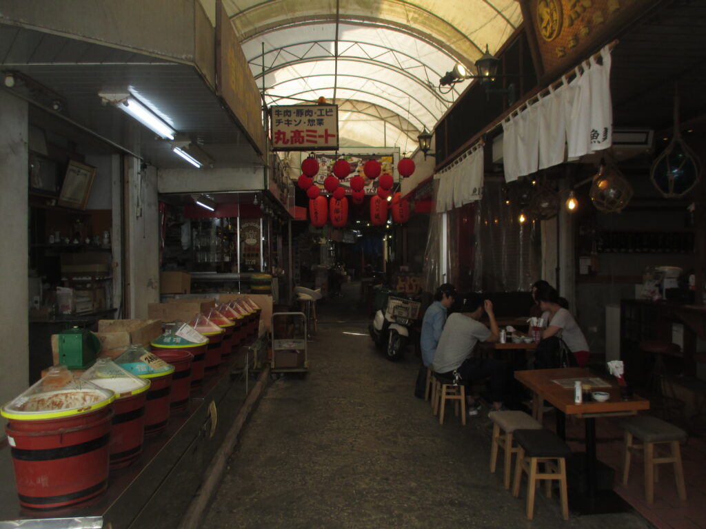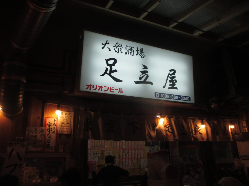 今では沖縄の多くのお店で普及しているセンベロメニューですが、その始まりは「足立屋」と言われています。2日後に再び牧志公設市場周辺を訪れると、足立屋も賑わっていました。