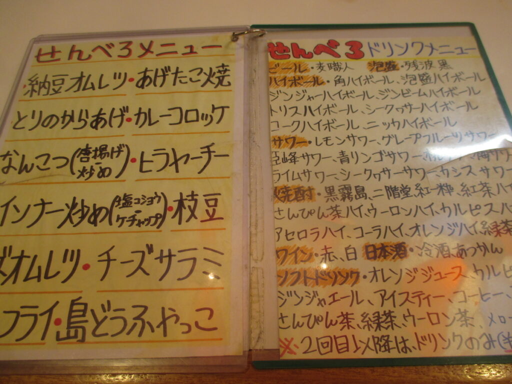 センベロは1000円でドリンク3杯とサイドメニューを楽しむことが出来るセット。沖縄で人気の呑み方です。私が写真のメニューにはない『串揚げ5本』を注文しました。