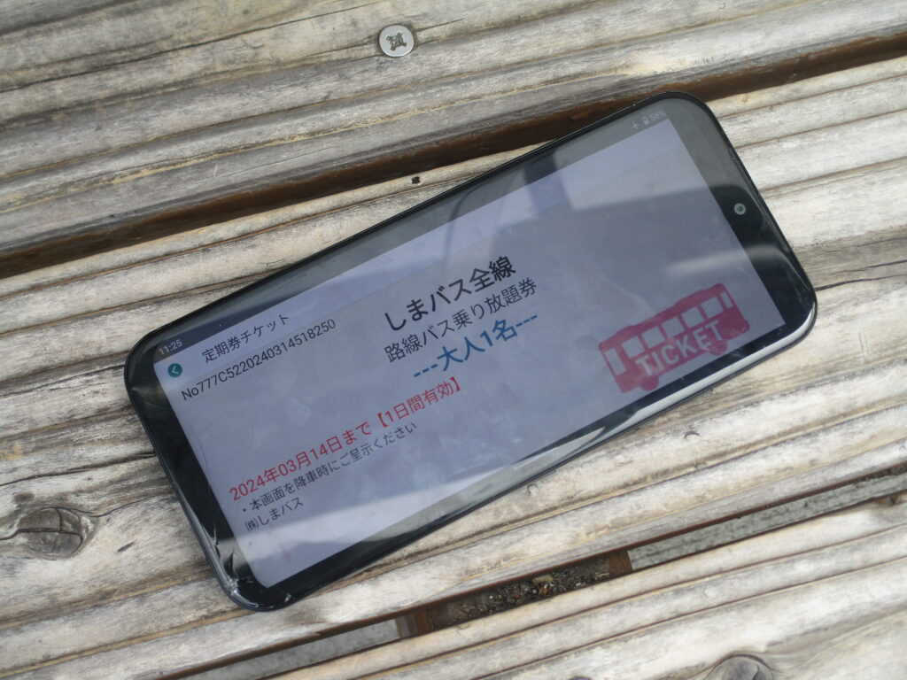 「バスもり!」というアプリで、路線バスの1日乗り放題券(2,400円)を購入。下車時に運転手さんへこの画面を見せるだけでOKです。