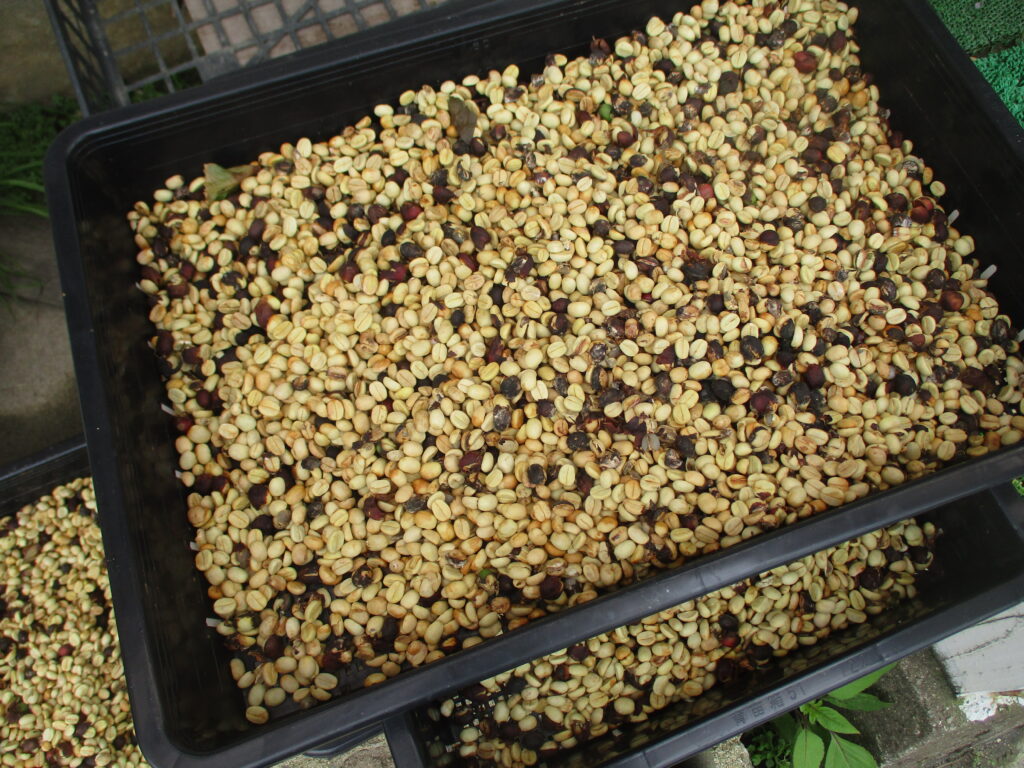 また、道路沿いにあったコーヒーの木のそばには、果実から取り出され、乾燥のために天日干しされているコーヒーの種(いわゆるコーヒー豆)もありました。