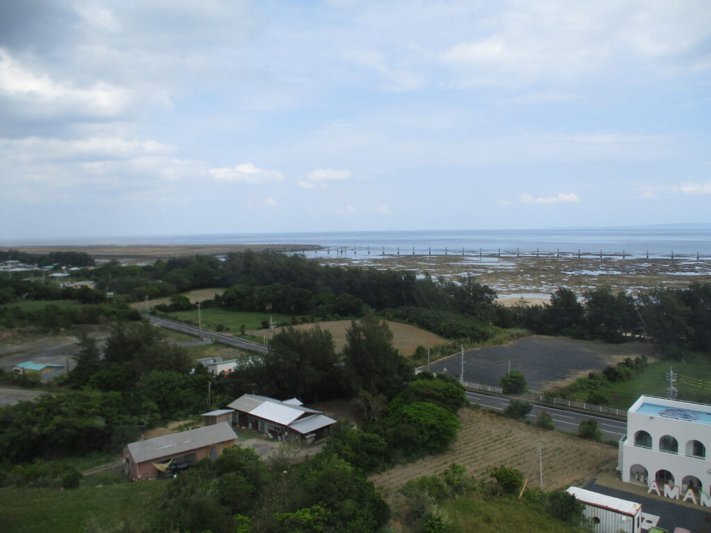 展望台からの景色。サンゴ礁の上に建てられた現在の奄美空港と、うっすら喜界島(写真右)も見えています。1964年の供用開始当初、空港は奄美パークの場所に位置していました。しかし、航空輸送需要の増大や大量高速輸送時代に対応できず、滑走路の延長が求められるようになります。用地確保が難航したため、現在地に新空港を建設することが決定され、1988年より供用が開始されました。