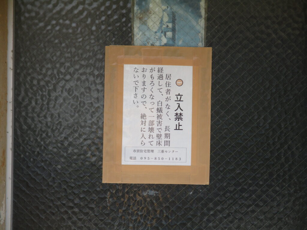 しかし、建物のほとんどは立入禁止。張り紙によると「居住者がなく、長期間経過して、白蟻被害で壁床がもろくなって一部壊れておりますので、絶対に入らないで下さい」とのこと。また連絡先は【市営住宅管理 三重センター】となっています。