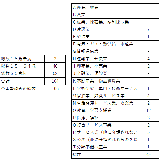 2020年の国勢調査によると、池島の人口は106名となっていますが、年代や男女別の人口を合計すると104名となり、何故か計算が合いません。また、小中学校があるので、働いている人の4分の1は学校関係者。第一次産業に従事している人はいないようです。