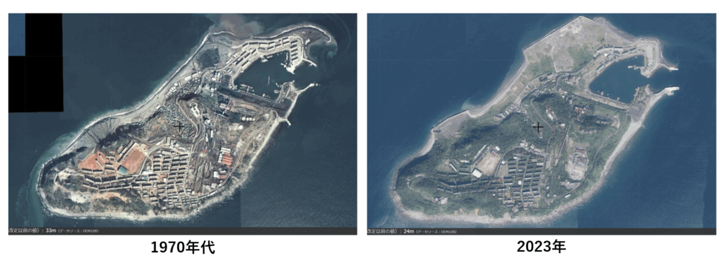 炭鉱ができる以前の池島は、半農半漁の島だったといわれています。しかし、その頃の歴史については、インターネット上にほとんど情報が見当たりません。1970年代と2023年の空中写真を比較すると、当時の島には緑がほとんどなく、大規模な開発が進められていた様子がうかがえます。