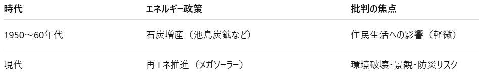 ただし決定的に異なる点として、ChatGPTは「炭鉱開発では雇用や住宅といった直接的な利益が地元に還元されたのに対し、メガソーラー開発では経済的恩恵が地域に届かないことが多い」ことを指摘しています。さらに現代では、メガソーラー開発に対して環境・景観・防災面での批判も強いです。