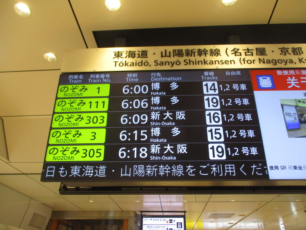 のぞみ号はGWやお盆、年末年始などの繁忙期に全車指定席となりますが、それ以外の日程では自由席も設定されています。今回は利用するのはその自由席です。