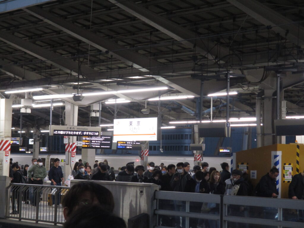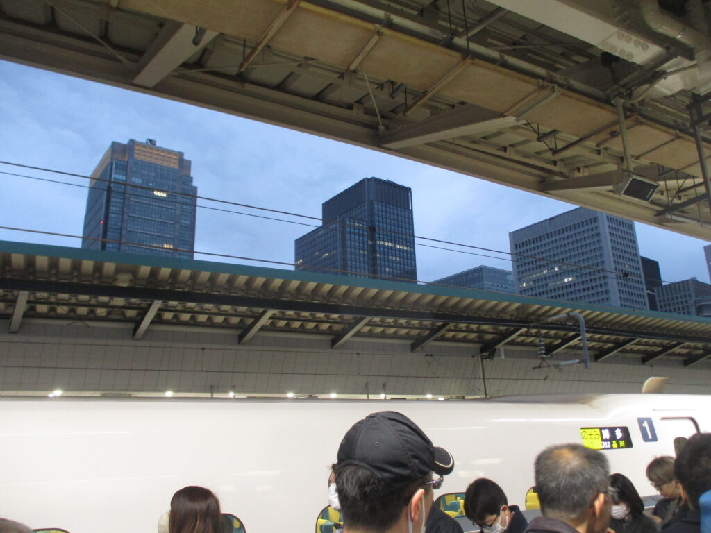3連休初日のこの時間でも、すでに入線しているのぞみ1号の向こう側にそびえるビル群には明かりが灯されていました。そして、写真からも分かる通り、新幹線ホームにも多くの人が乗車を待っています。