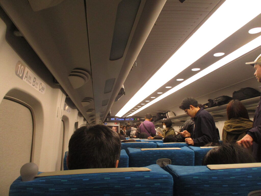 名古屋駅を過ぎても通路は人で埋まり、京都駅、新大阪駅を出発しても状況は変わらず。