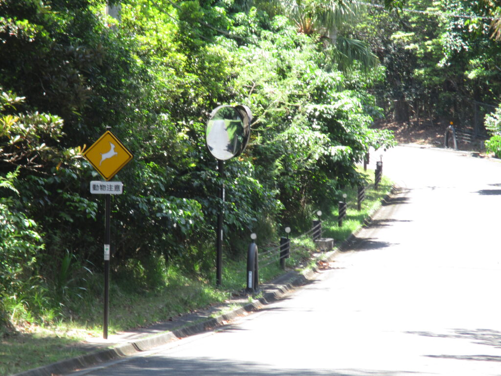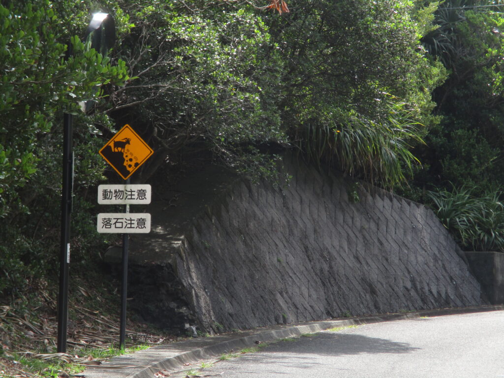 一見すると「シカに注意」の標識のように見えますが、描かれているのはシカではなくヤギです。父島には野生のヤギが多数生息しており、時折道路にも姿を現します。
