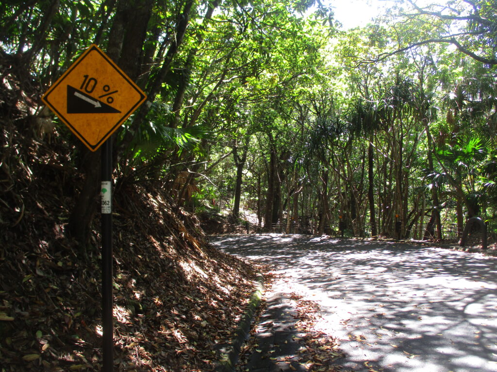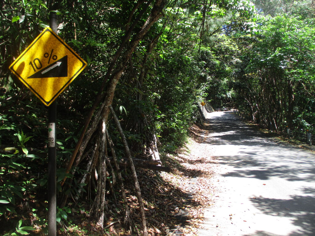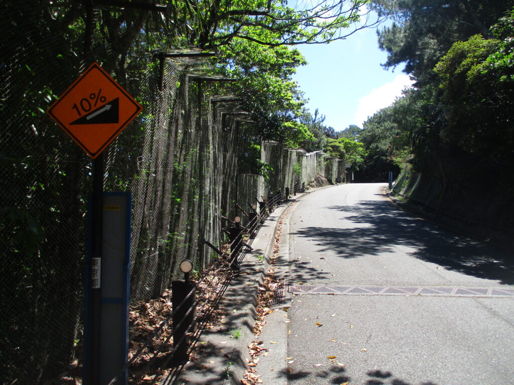 勾配10%を示す標識です。正確に数えたわけではありませんが、上り下りともに10%の標識が各所に設置されています。なお、確認できる限りでは、10%以外の勾配を示す標識は見当たりません。