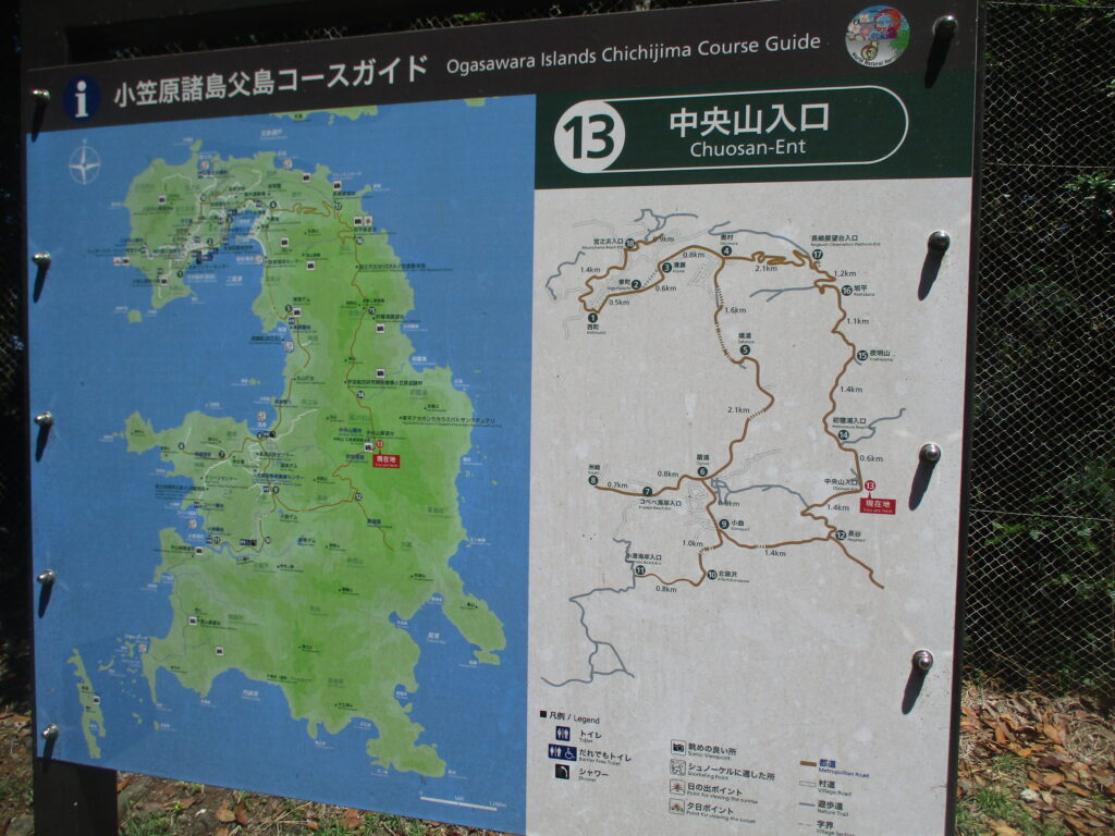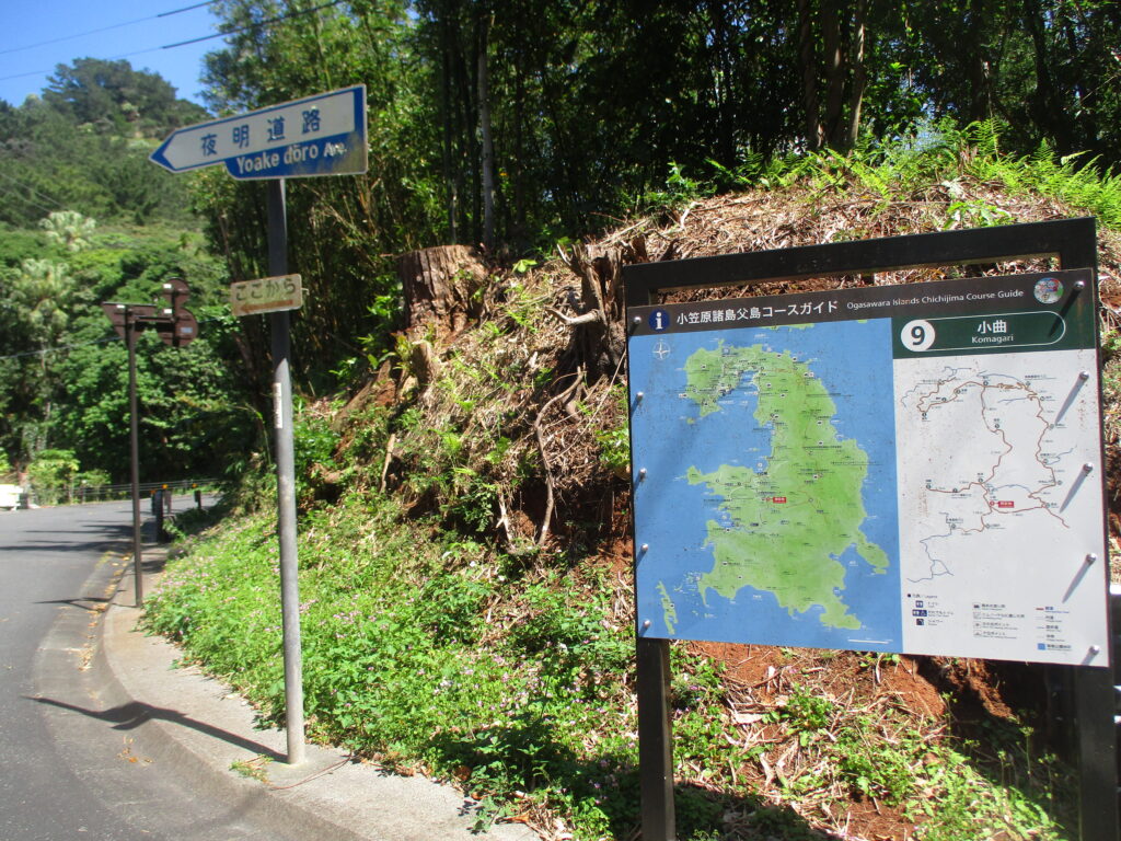 13時40分、ついに夜明道路の終点に到着。中央山からここまでは下り坂が多く、寄り道するような場所もないので、それほど時間はかかりませんでした。ちなみに、この終点地点にあるのが、先日訪れた小笠原コーヒーを飲んだカフェ「グレース・島のお茶やさん」です。