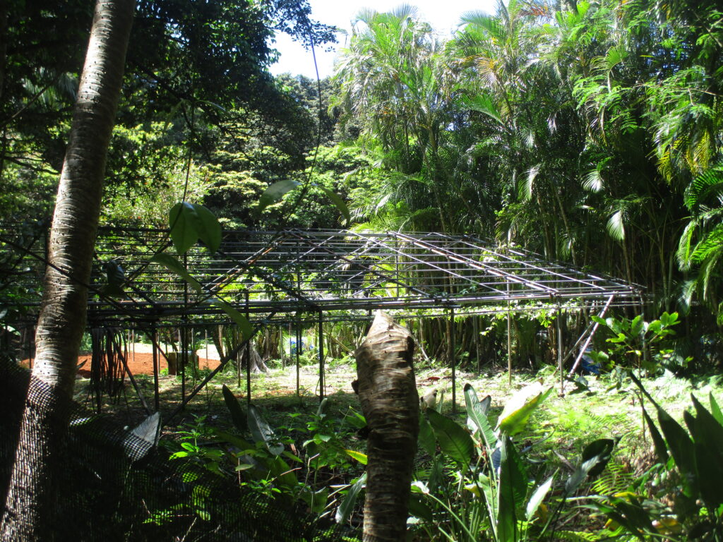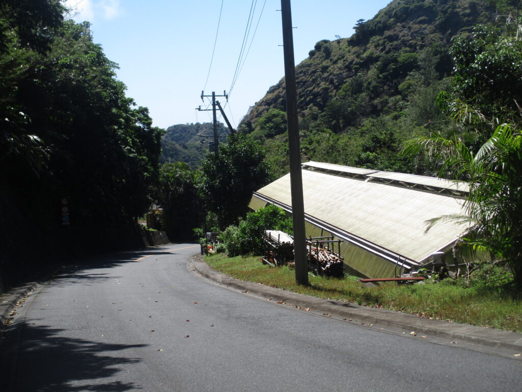 ビニールハウスの骨組みらしきものがありました。父島の森の大部分は国立公園なので、今から開墾して畑にすることはできないはず。夜明道路沿いにある人工的な施設はすべて国のものです。ということは、これも国のハウスなのか、それとも昔から開墾されていた誰かの土地なのか……謎に包まれています。