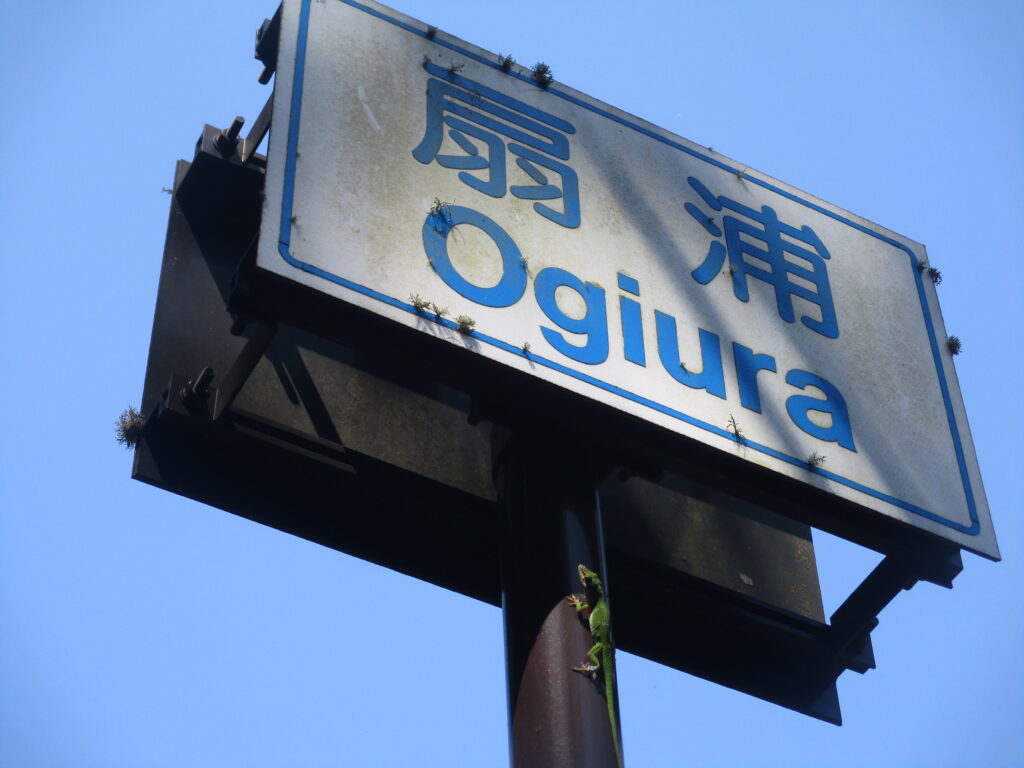 扇浦地区に入りました。標識には草が付着していたり、柱にはトカゲ(グリーンアノール)がいたりと、標識ひとつからも大自然を感じられます。