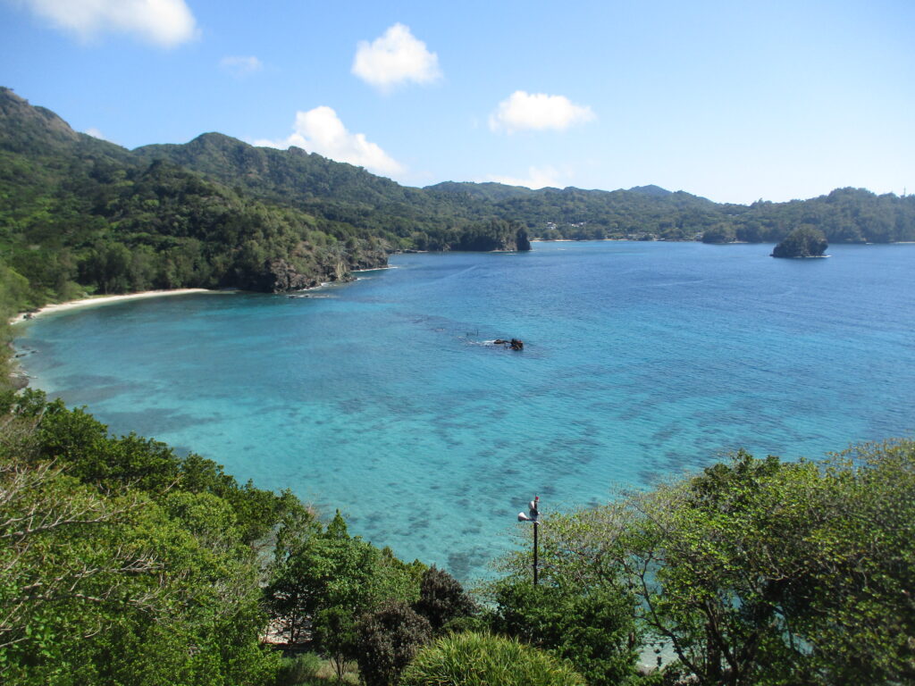 こちらは道路沿いから見た境浦海岸の景色。島を1周する道中では随一の絶景スポットといえるでしょう。この美しい海で座礁し、戦時中からそのまま残されているのが「濱江丸」という船です。