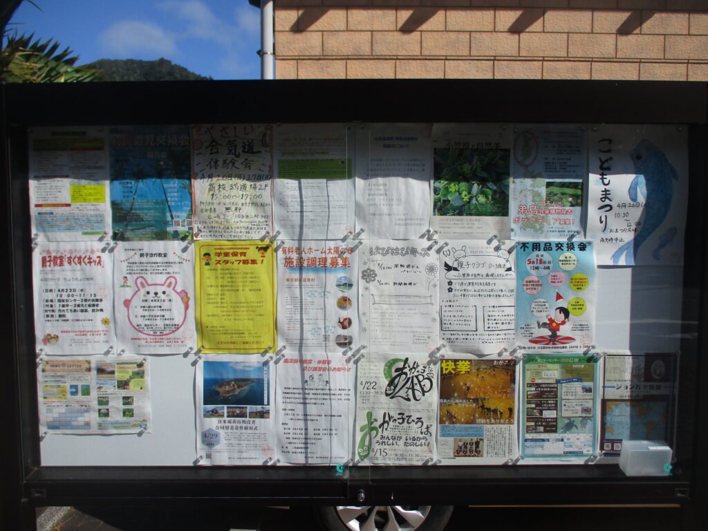 離島の掲示板で、ここまで掲示物が多く、かつ日付も最新のものになっているのはかなり珍しいです。島の活気が感じられます。