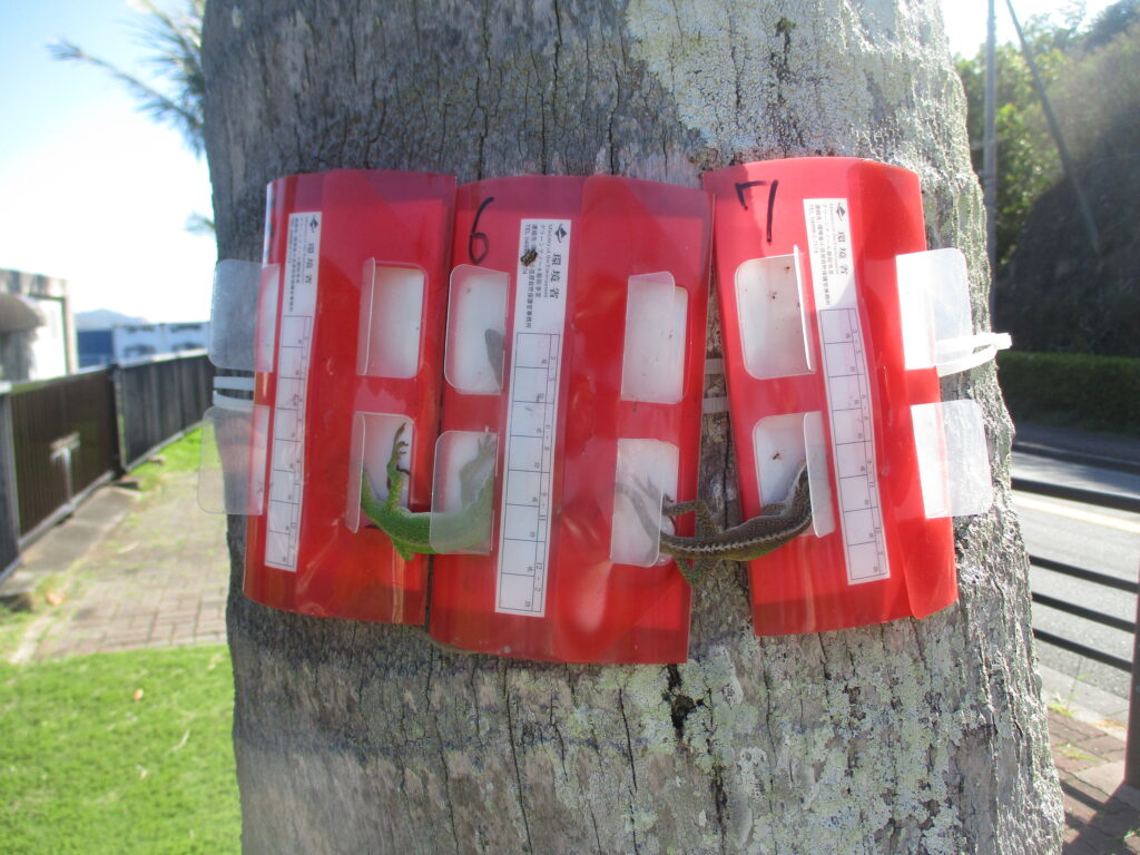 港周辺の木々には、先ほど扇浦の標識にもいた外来種のトカゲ・グリーンアノールを捕獲するための、通称「アノールホイホイ」が設置されています。ちょうど捕まっているアノールを見ることができました。
