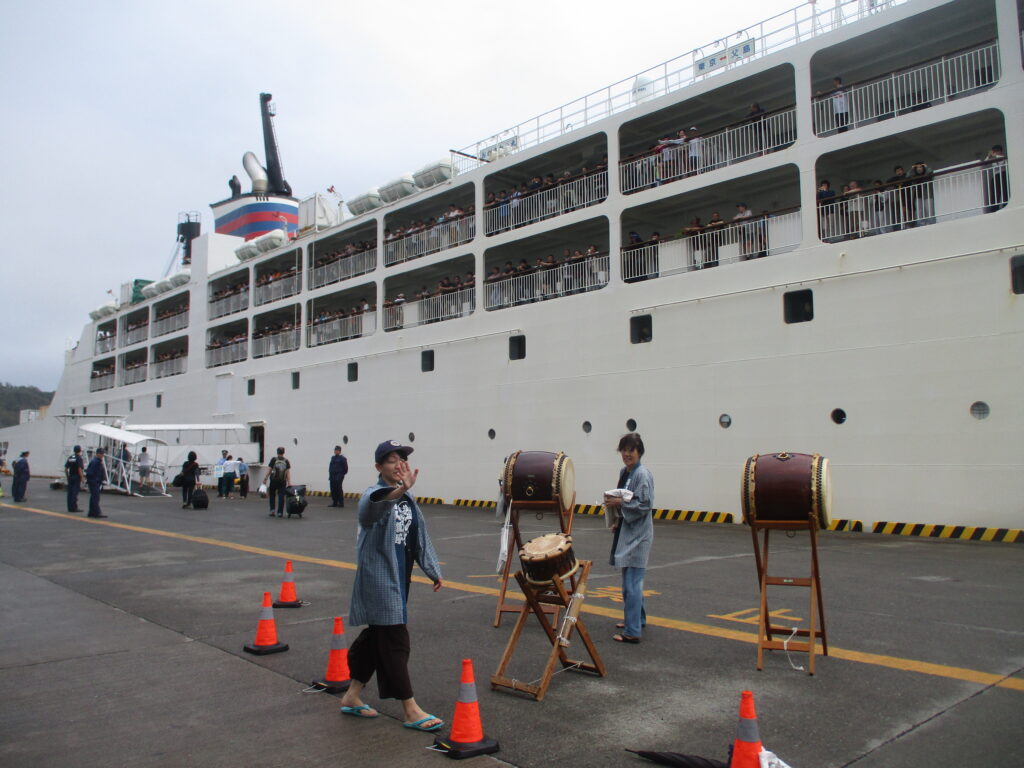 そして、14時半過ぎに港で記念撮影をして、そのまま乗船。リピーターが多く、動きに慣れている人が多いため、全体的にやや慌ただしい雰囲気になります。その結果、見送りの太鼓をじっくり味わう余裕はあまりありません。