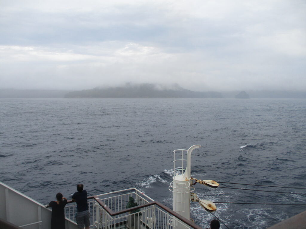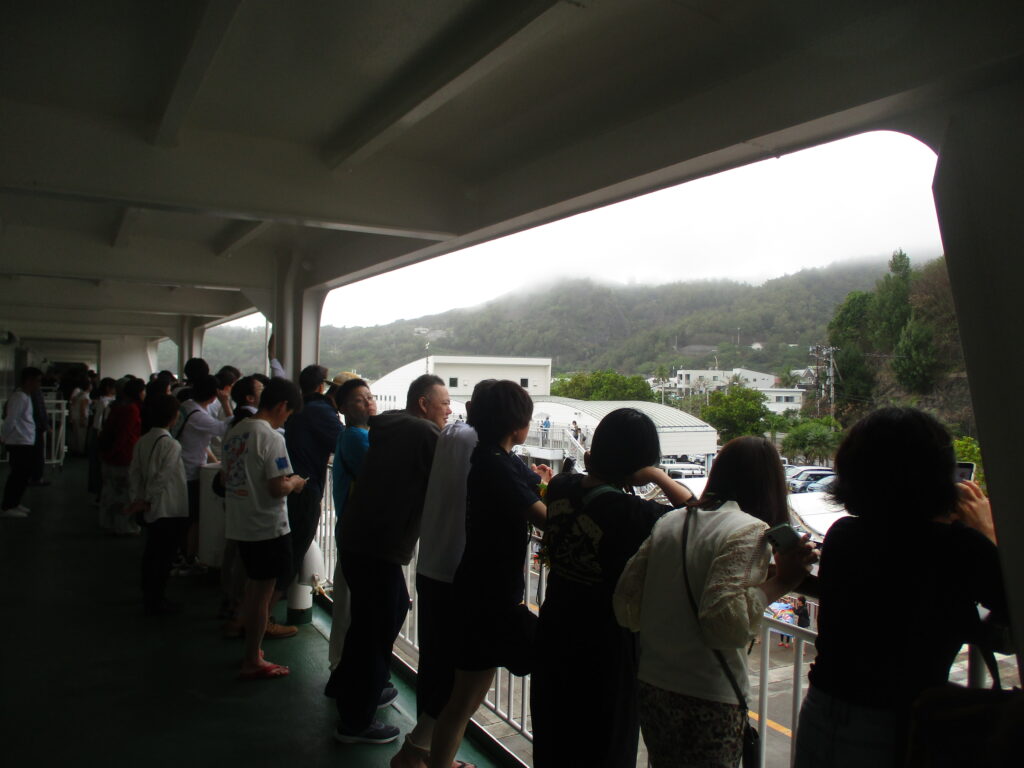 見送り船がいなくなった後も、デッキから遠ざかる父島列島を眺めていると、なんとクジラが姿を見せてくれました。ただし天候は曇り。小笠原ユース名物・光通信も行われず、風も強かったため、その後は船内で過ごすことに。