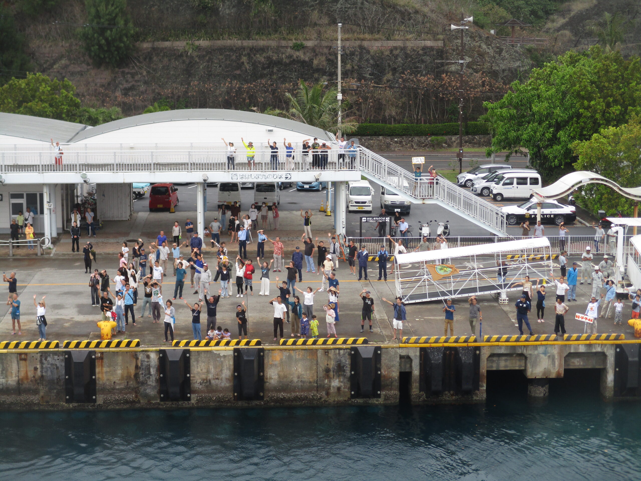15時、おがさわら丸は定刻通りに父島・二見港を出港。旅の終わりである一方、ここから24時間の船旅が始まります。港には今回も多くの人が集まり、小笠原らしい見送りの光景が広がっていました。