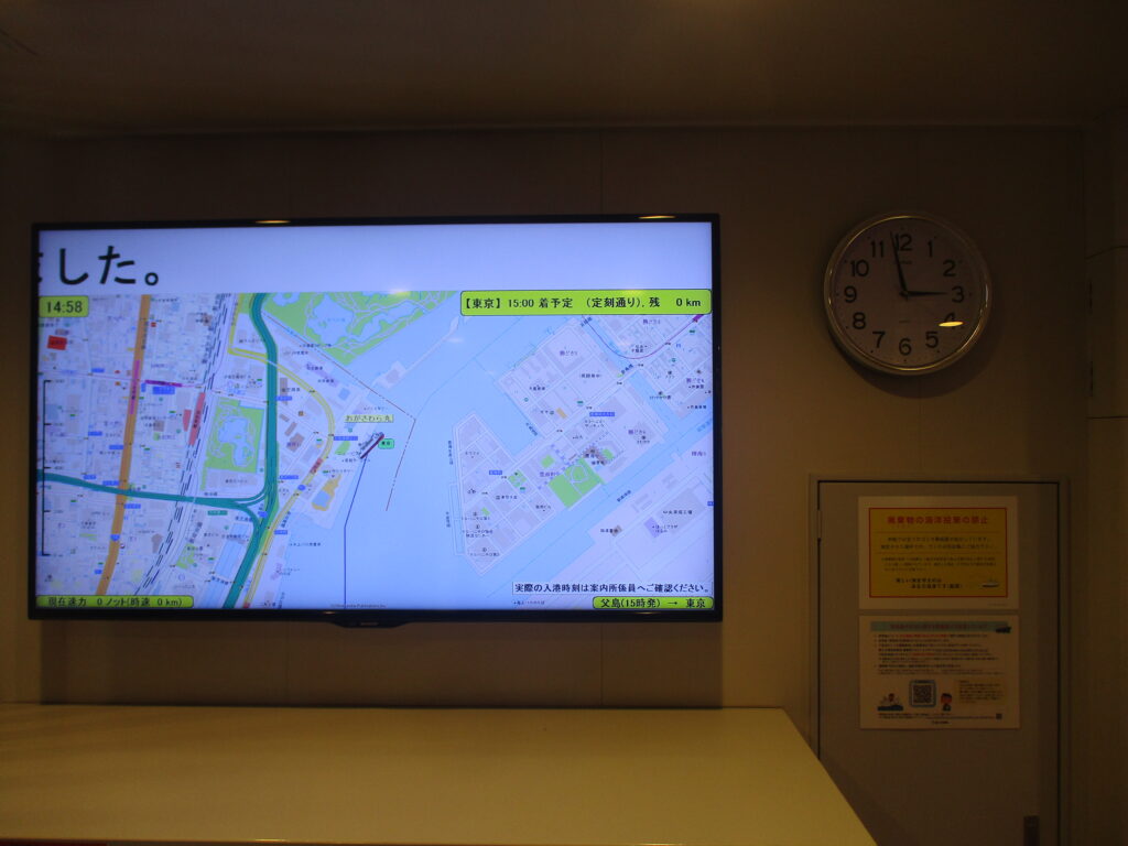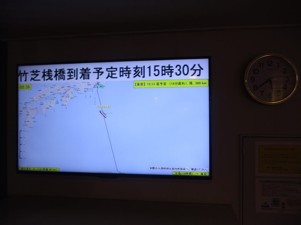 最終的に、この日のおがさわら丸は定刻通り15時に竹芝桟橋へ到着。なお、復路は海況だけでなく東京湾の混雑状況の影響も受けるため、往路より遅れやすい傾向があります。特に冬場は4時間程度遅れることもあるため、帰りのスケジュールには余裕を持たせておくのが無難です。