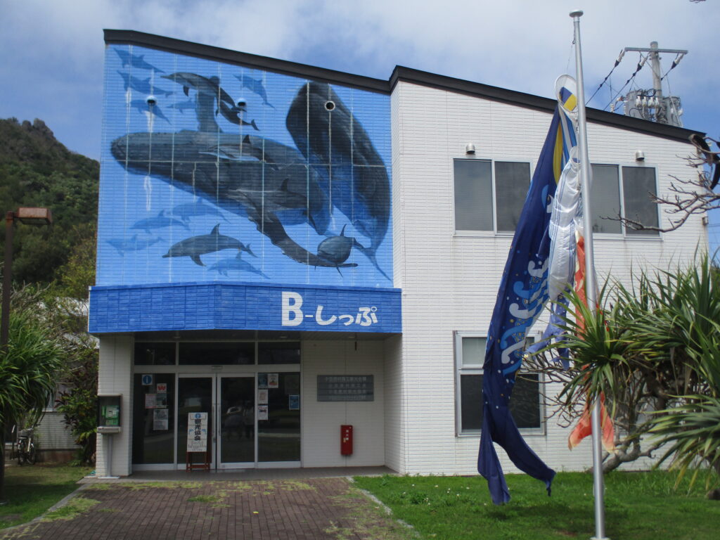 観光協会が入っている建物「B-しっぷ(商工観光会館)」の前では、ザトウクジラのシーズンになると、宙を泳ぐクジラのぼり(鯨のぼり)が掲げられます。