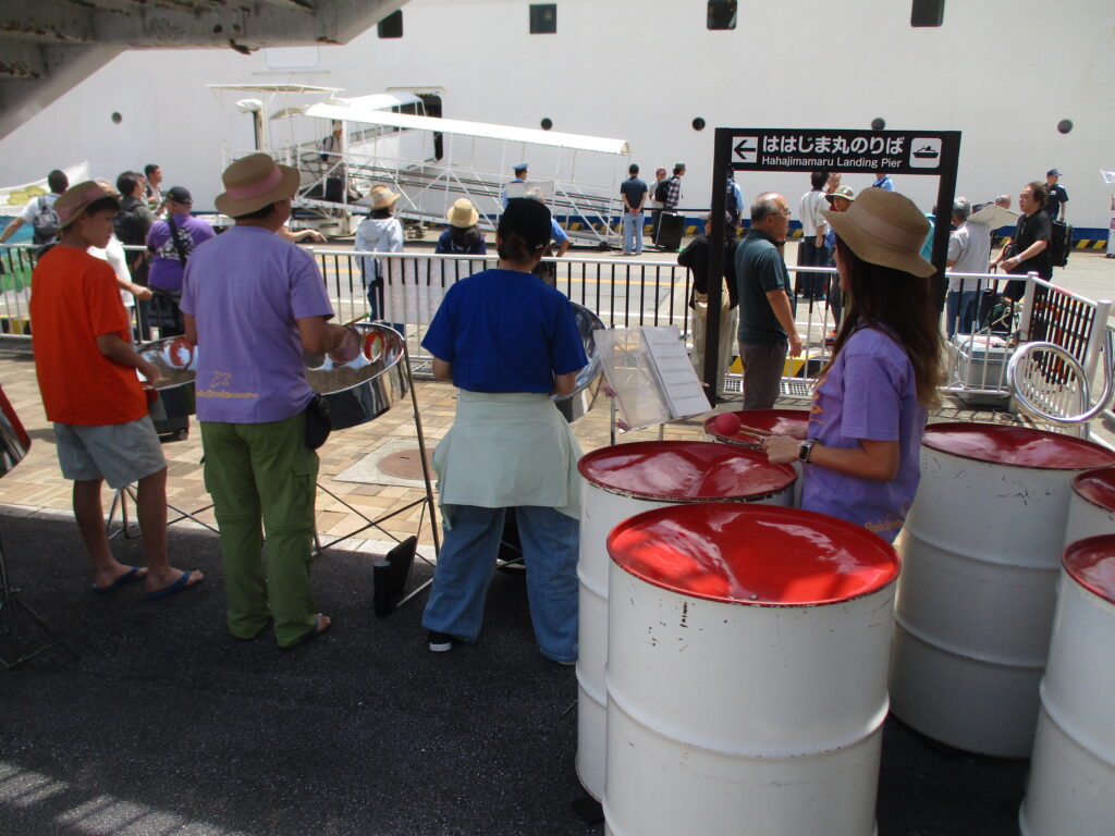 日曜日におがさわら丸が入港するとき、港ではスティールパンの演奏が出迎えてくれます。スティールパンは、ドラム缶から生まれたトリニダード・トバゴ発祥の楽器。演奏をしているのは、返還35周年のときに開催されたワークショップをきっかけに結成された島民サークル「BSO(ボニンスティールオーケストラ)」です。