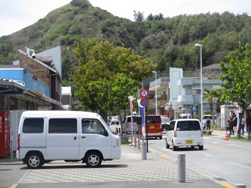 おがさわら丸が入港すると、それまでの静かな島は一変、急に忙しく動き出します。写真はメインストリートに渋滞が発生している様子。今便には448名が乗船していたようです(=448名が一気に父島へやって来た状態)。