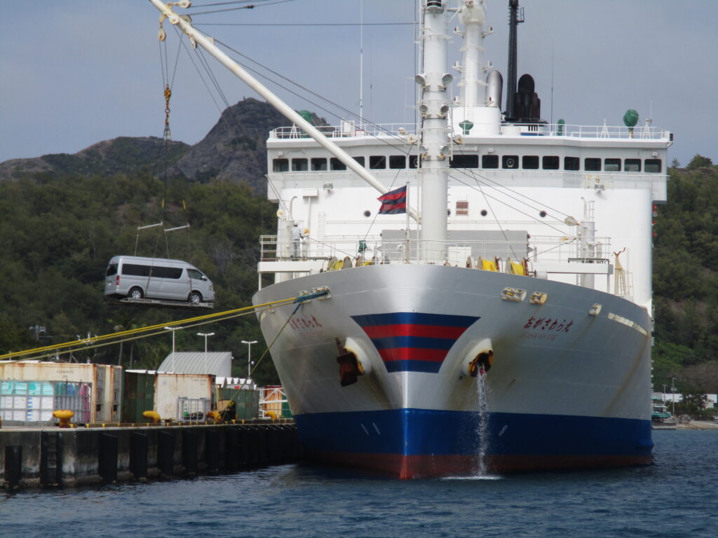 そして11時前、おがさわら丸がゆっくりと二見港へ入ってきました。船首と船尾にはコンテナが積まれ、島の生活を支える物資が運ばれてきます。船尾をよく見ると、この日は小さな船が積載されていました。恐らく海のツアーで使用される船でしょう。