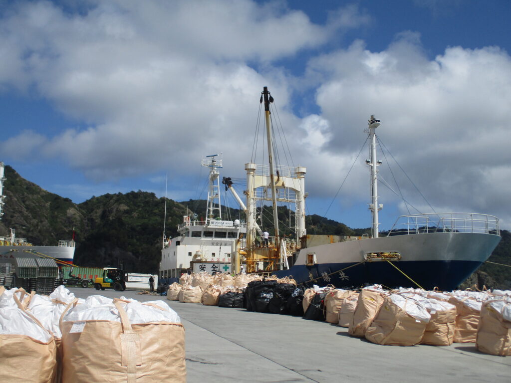 共勝丸が運ぶのは、おがさわら丸には載せることができないガソリンなどの危険物、車両、建設資材、産業廃棄物など。父島ではおがさわら丸の前方に停泊していますが、写真の通り、船周辺には大量の資材?が置かれており立入禁止となっています。