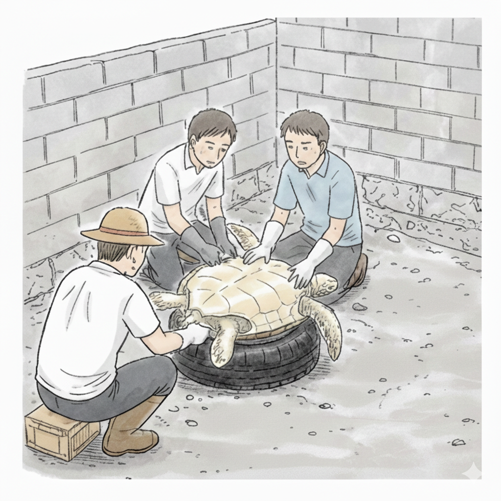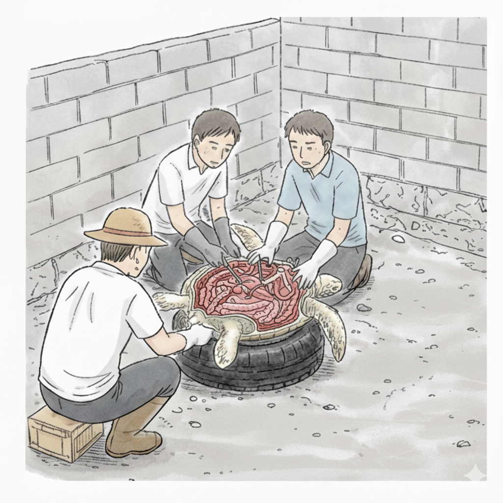 朝7時、指定された場所に向かうと、すでに作業は始まっており、重さ80kgもあるというアオウミガメが、まだゆっくりと呼吸をしながらタイヤの上に寝かせられていました。作業場はブロック塀に囲まれた簡素な空間です。