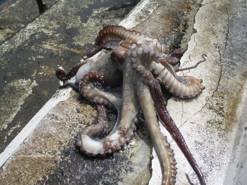 まずはタコ。島民の方は「タコカギ」という道具を手に何度か素潜りし、わずか数分で見事に捕まえてきました。ちなみに、このタコは私が泊まっている宿に寄付され、その日の夕食で提供されることに。
