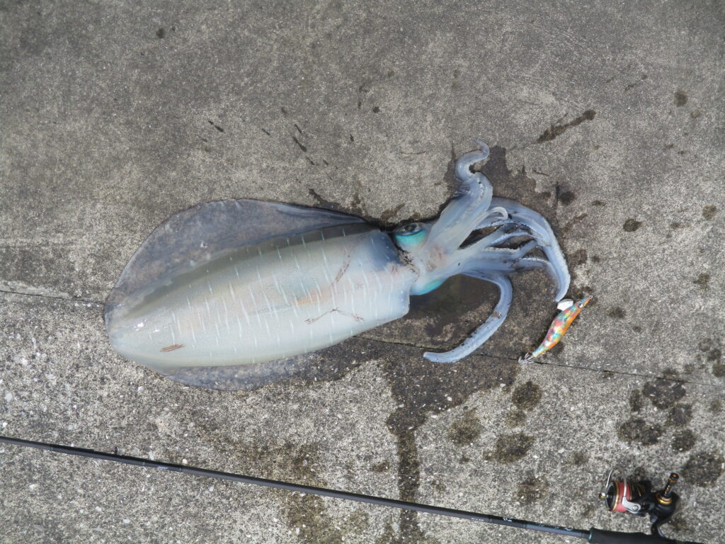 我々のすぐ横で釣り上げられたのは大きなイカ。その方も自転車でふらっと現れ、わずか5分ほどでこのイカを仕留めると、自転車のかごに入れて颯爽と帰っていきました。