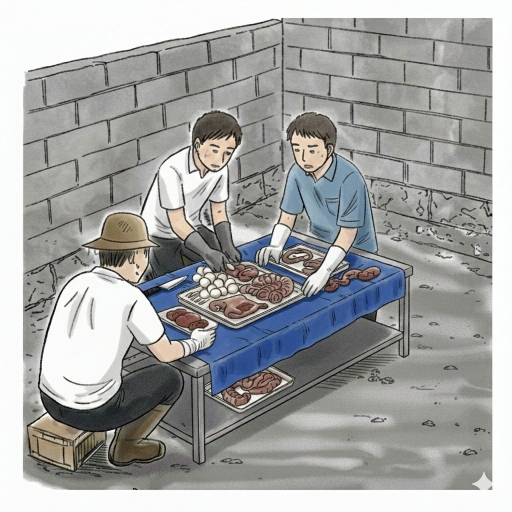 次に胴体と手足を切り分け、部位ごとに分解した後、それらをドラム缶で煮込み、皮を丁寧に剥ぐ流れです。最後は食べやすい大きさにぶつ切りにし、同時に取り出した内臓もそれぞれ仕分けながら処理していきます。ちなみに、解体中に強い匂いはありません。