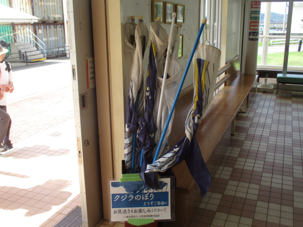 船客待合所には「クジラのぼり」が置かれていました。ははじま丸のお見送りをするときに、自由に使っていいようです。しかし、今回は日帰りなので、お見送りを楽しむことが出来ません。
