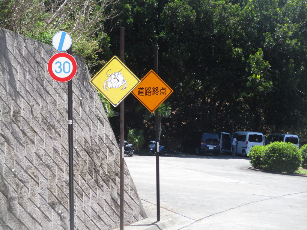 「オカヤドカリに注意」と並んだ「道路終点」の標識。ここが都道最南端の地です。