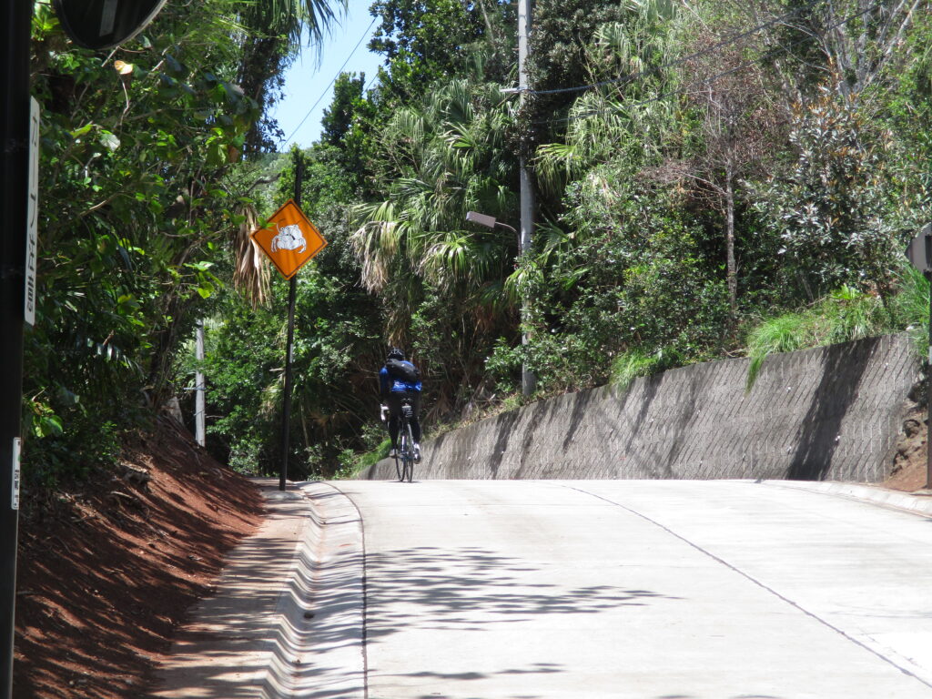さっそく「オカヤドカリに注意」の標識が登場しました。小笠原諸島での個体数減少を受けて、1970年に天然記念物に指定されたヤドカリですが、現在は沖縄や奄美など南西諸島でもよく見られます。天然記念物だった当時、沖縄はまだ米軍統治下だったというのがポイントです。