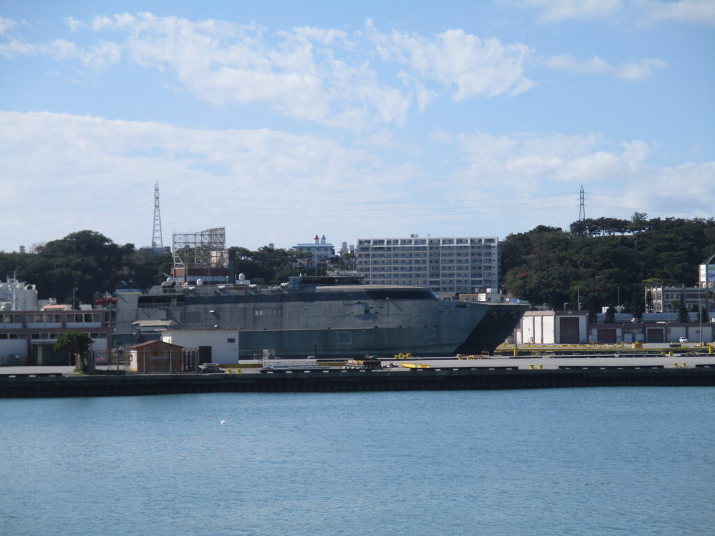 那覇ふ頭の南岸にある「那覇港湾施設」とは、いわゆる米軍基地のこと。米軍が必要とする貨物や人員を艦船で輸送するための積み下ろしなどを行う機能を担っているそうです。この日も、いかにもそれらしい雰囲気の船が停泊していました。