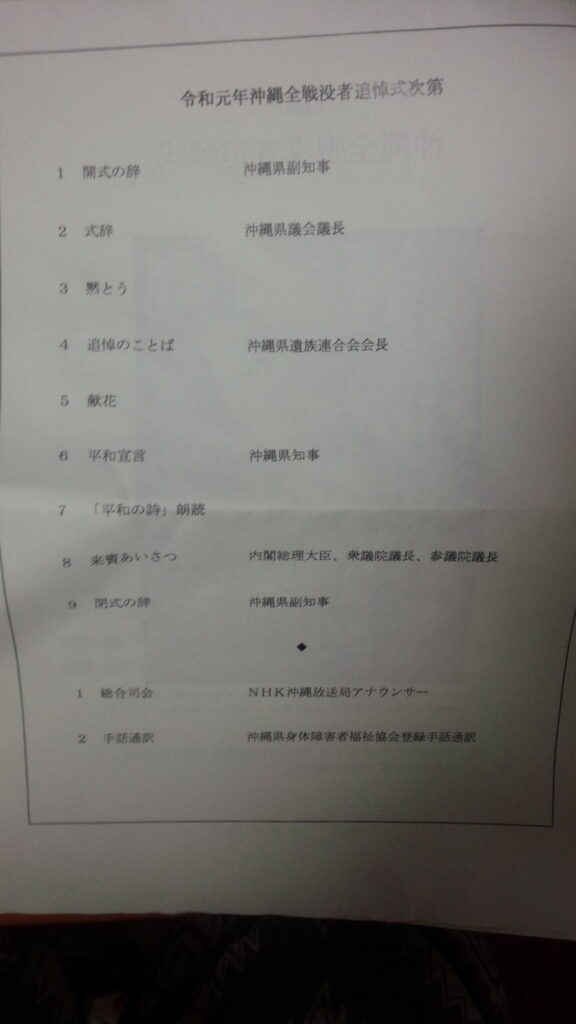こちらが式次第。注目すべきは内閣総理大臣(当時安倍首相)の挨拶。県民投票が行われてから、安倍さんは初めての沖縄訪問と思われます。果たして何が語られるのでしょうか。
