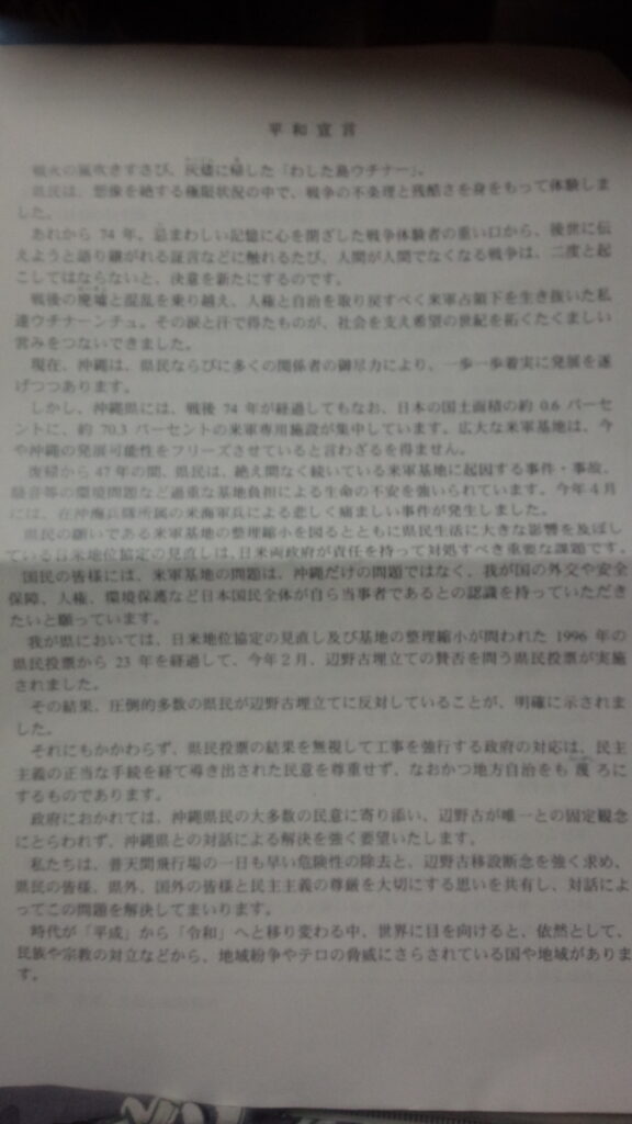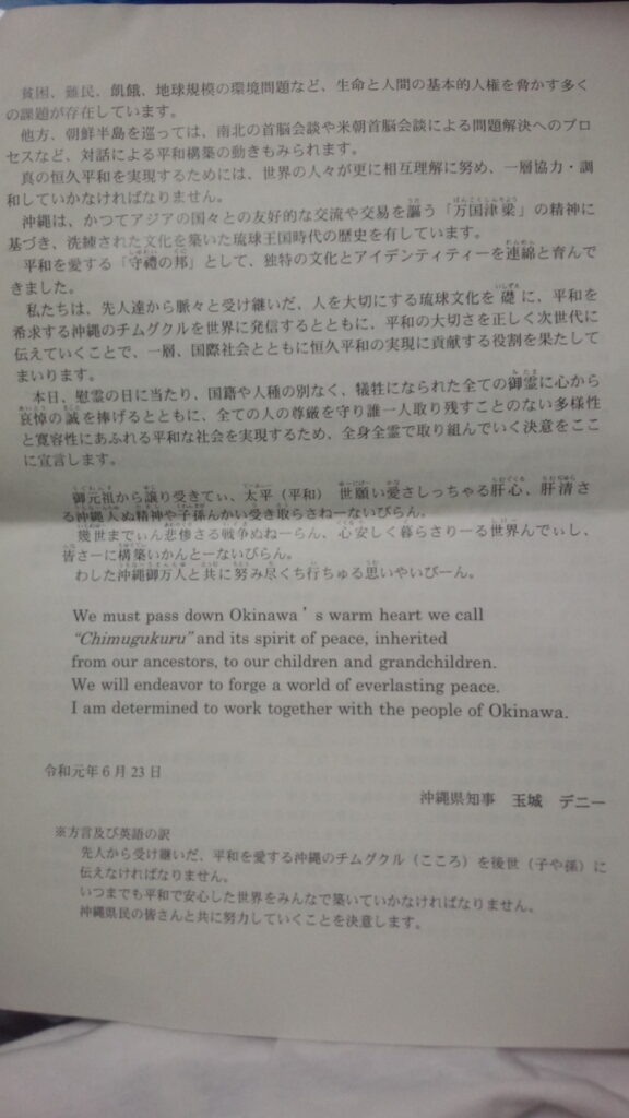 こちらが玉城知事の平和宣言。この紙の3分の1が基地に関わる内容で、「沖縄にとっての平和って何なんだろうな」と考えさせられます。もし沖縄から米軍基地が無くなったとき、何を話すのでしょうか。知事の話の節々で拍手や指笛が起こっていました。