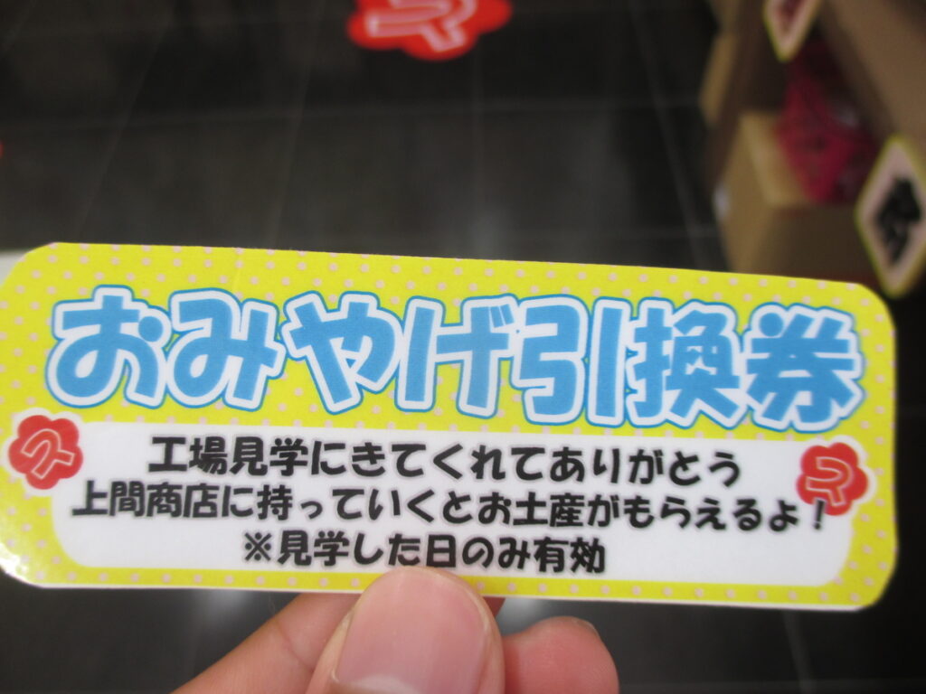 参加者には「おみやげ引換券」が渡されるので、工場見学終了後、この券を工場併設の上間商店へ持っていくとお土産がもらえます。