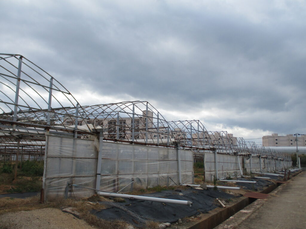 こちらは港の前に並んだビニールハウス。背後には炭鉱の島ならではの炭鉱住宅が見えます。作物は見当たりませんが、全体的に綺麗なので、現在もこのハウスは使われているのでしょう。軍艦島や池島のように、炭鉱の島は閉山後に急速に衰退する一般的イメージとは対照的に、この島では今も人々の暮らしが続いています。
