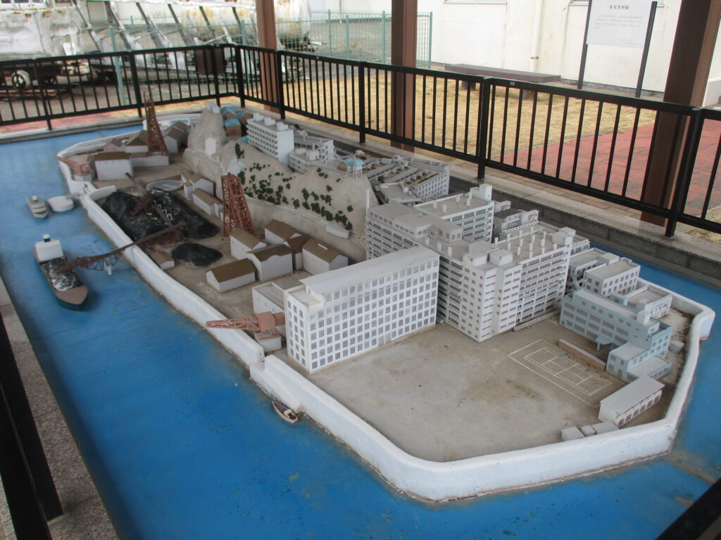 資料館の外には、炭鉱で栄えていた当時の軍艦島を再現した模型が展示されていました。現在の軍艦島は、残る建物のすべてが廃墟で、島内に資料館もありません。当時の姿を知ることができる数少ない貴重な資料の一つです。