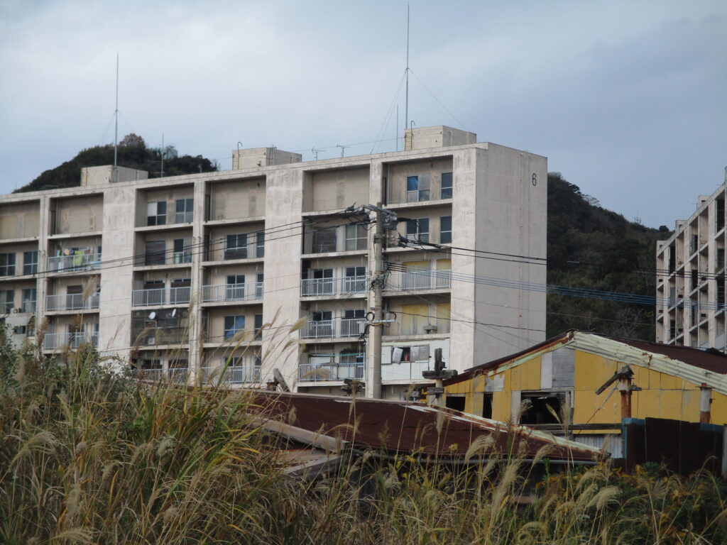 こちらのアパート群は外観も比較的綺麗で、現在も人々の暮らしが続いている様子が伺えます。島内を歩いた印象では一戸建て住宅はあまり見られず、今も多くの島民が、かつて炭鉱住宅として使われていたアパートに暮らしているように感じられました。