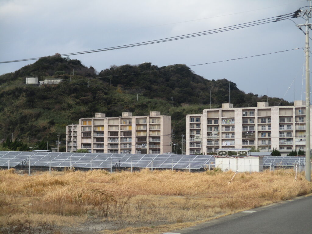 かつて炭鉱関連の施設があったこの辺りの平地には、ソーラーパネルが並び、太陽光発電が行われています。