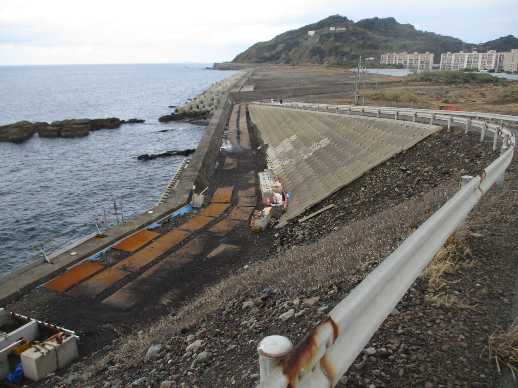 鉱山閉山後、軍艦島は無人島となった一方で、高島には今も300人以上が暮らしており、軍艦島が見える丘へ向かう道路では法面工事が行われていました。