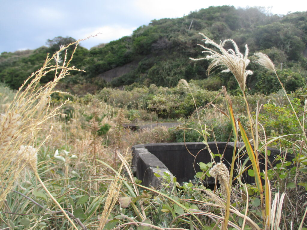 看板の手前から草むらを覗いてみると、コンクリートの構造物がありました。きっとこれも炭鉱の関連施設だったのでしょう。