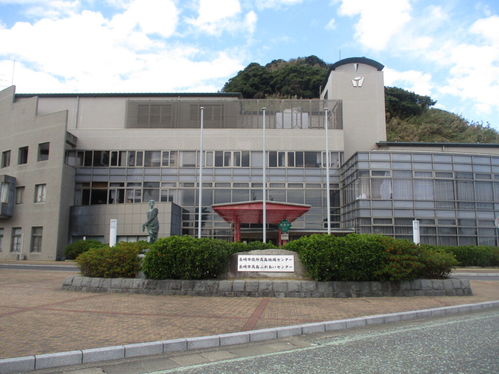 こちらは長崎市役所高島地域センターと長崎市高島ふれあいセンター。離島におけるコミュニティ活動の活性化や、他地域との交流促進、個性豊かな地域づくりを目的として建設された施設で、コンサートなどに利用できるホールや図書館も併設されています。